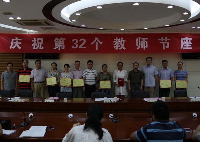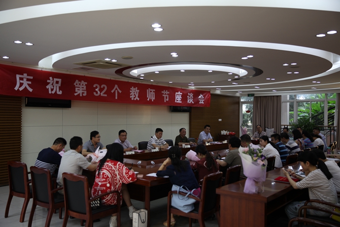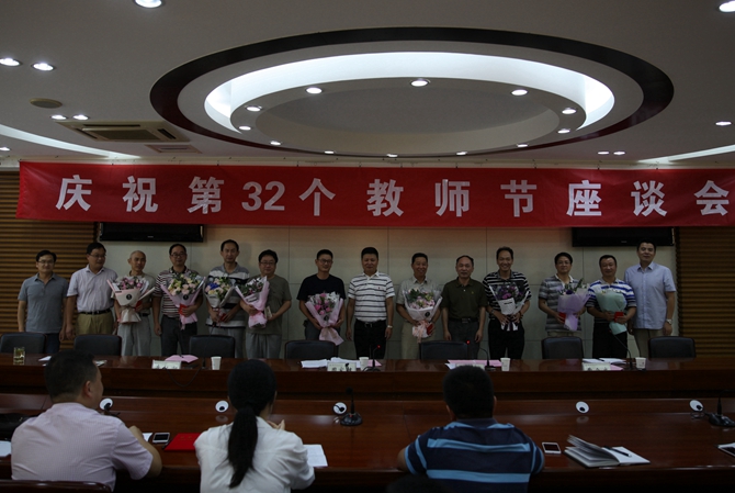 校党委副书记丁根林主持座谈会。相关职能部门负责人、各党总支书记、部分教师代表参加座谈会。会议表彰了学校第四届“三育人”先进个人及满30周年教龄的教师。周家健书记和与会的学校党政班子领导为受表彰的教师颁发荣誉证书、敬献鲜花。