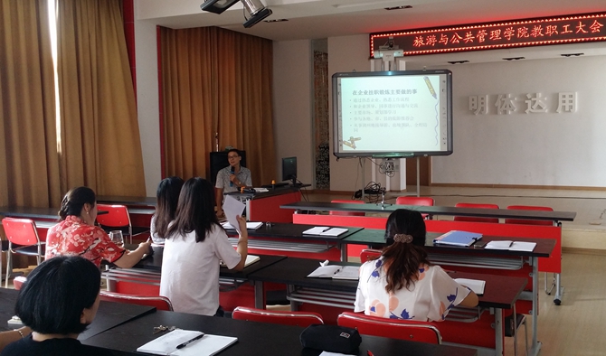 商贸与经济管理学院召开庆祝第32个教师节暨新学期教职工大会,传达学习校党委书记周家健在学校庆祝第32个教师节座谈会上和新学期干部会议上的讲话精神,号召全体教职工做有理想信念、有道德情操、有扎实学识、有仁爱之心的“四有”好老师;同时,会议还就新学期省优势(特色)专业申报、服务地方、课堂创新改革、教学质量评价体系等重点工作作了部署。当天,机电与汽车工程学院在庆祝第32个教师节暨新学期全体教职工大会上,就优势专业四年制本科申报、深化校企合作领域、促进科研成果转化、教师工作室及学生创新班运行也作了相关部署。旅游与公共管理学院则通过召开专业教师企业挂职经验交流会庆祝第32个教师节。会上,熊友平、张安民、王丰元、孟姝芳为学院全体教职员工分享了在企业挂职锻炼的心得体会。