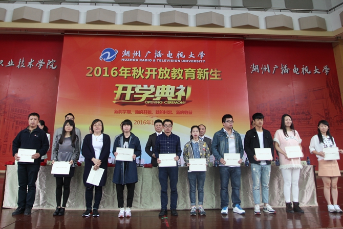 校党委副书记丁根林宣读了2015年度国家开放大学“希望的田野”奖学金获奖学员、2015年度国家开放大学奖学金获奖学员和2016年浙江广播电视大学奖学金获奖学员名单,主席台领导为各批次获奖学员颁奖。新生代表、2016秋工商管理专业本科徐丽同学,农民大学生新生代表、2016秋市场营销专业本科项继忠同学以及湖州电大教师代表朱桃英老师分别作了大会发言。