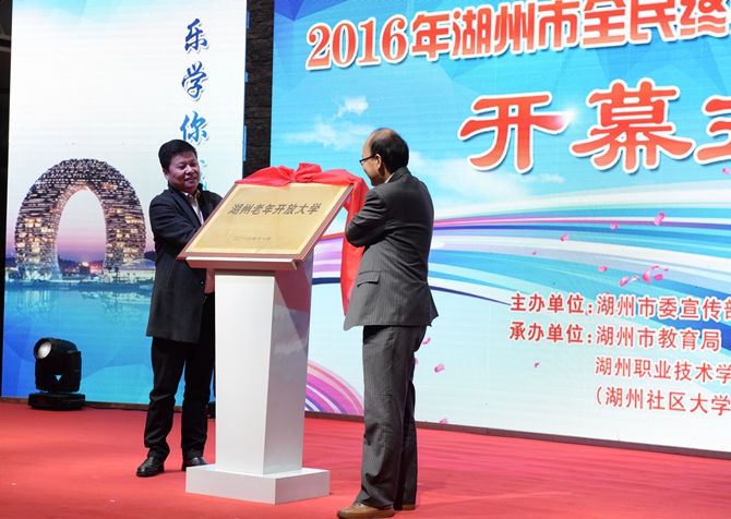 方新旗宣布2016年湖州市终身学习活动周开幕。眭宝良与周家健共同为湖州老年开放大学揭牌,周家健为湖州社区大学首批六家终身教育与学习体验基地合作单位授牌。开幕式上,2016年湖州市“百姓学习之星”、“终身学习品牌项目”、中老年书画摄影大赛等各类获奖代表分别获得表彰。市民代表、2016年湖州市“百姓学习之星”厉奇山宣读《终身学习倡议书》,向全体市民发出“全民学习、终身学习”的倡议。