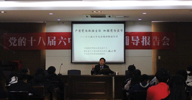 为推动党的十八届六中全会精神进课堂,把党的理论创新的最新成果传播到大学生中,11月30日下午,思想政治理论教研部、校团委、马克思主义讲习所共同举办了大学生十八届六中全会精神专题辅导报告会。