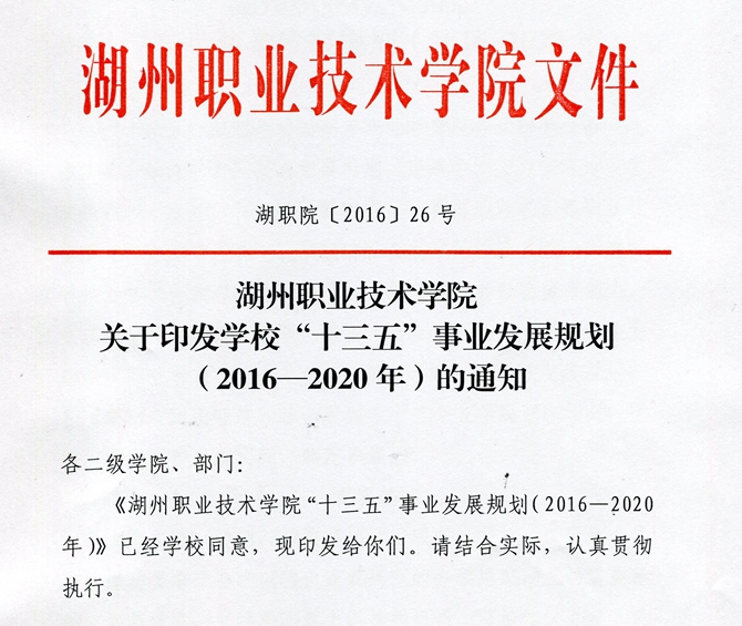 视点:11月10日,学校正式印发《“十三五”事业发展规划(2016-2020年)》(湖职院〔2016〕26号),提出了“到2020年把学校建成与地方经济社会发展相适应,办学特色鲜明、综合实力强劲、服务优势明显、文化氛围浓厚、社会满意度高的省内有地位、国内有影响的区域性高职名校”的目标愿景。作为对学校未来发展意义重大的纲领性文件,在《规划》编制过程中,学校党委、行政始终坚持高处站位,理念更新,以高等职业教育发展迎来新机遇、区域经济社会发展呈现新常态的站位来审视学校转型发展面临的新挑战;自2015年10月启动《规划》编制以来,通过全员参与,广泛汇聚各方面的思想智慧,先后历时一年,数易其稿,达到了统一思想、凝聚共识的目的。