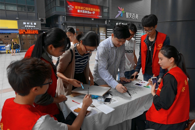市区里“志愿身影”快闪歌舞环保传承。在湖城爱山广场、衣裳街等人潮涌动的闹市区,物流与信息工程学院的志愿者以“快闪”舞蹈的形式宣传“剿灭劣V类水”,吸引大量路人驻足观看;旅游与公共管理学院的志愿者在爱山广场分发环保宣传册,并号召市民在签字布上签名;商贸与经济管理学院的志愿者走进湖州罗师庄“阳光假日小屋”,带领外来民工子弟的孩子共同学习“五水共治”相关知识,并观察巡视了社区周边河道,经过现场实地的观察和简单通俗的讲解,让孩子们生动具体地了解到“五水共治”的意义。