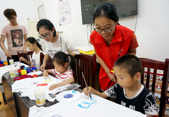 手绘文化衫:绘出文明之花。6月4日下午,我校志愿者走进紫云小区开展了手绘文化衫活动,志愿者首先在小区活动室对参与活动的孩子们进行了文明城市相关常识的讲解,普及了垃圾分类知识,随后20多位孩子以“社会主义核心价值观”为主题,在志愿者的帮助下,一起在文化衫上创意合作,五彩的画笔不停挥舞,勾勒出各式各样的图案,稚嫩的小手在不停着力,为画作注入美好与憧憬,绘出充满童真、童趣和创意的作品。绘制完毕后,孩子们开心展示着共有的杰作,作品还在社区活动室展出。