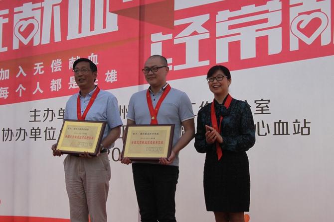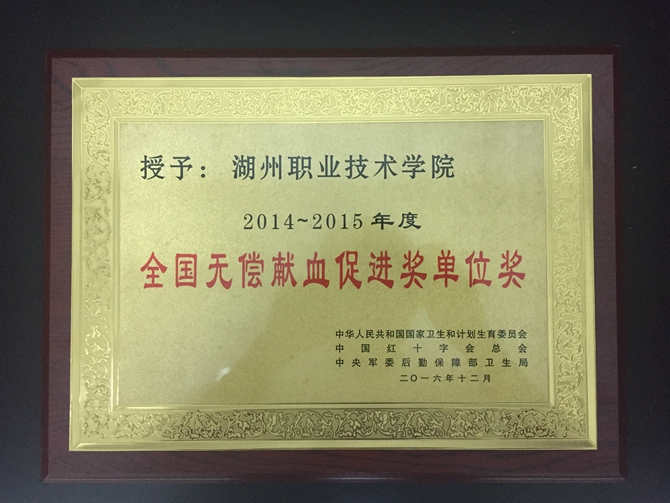 在日前结束的湖州市“6•14世界献血者日”宣传活动上,湖州市人民政府副市长闵云将“2014-2015年度全国无偿献血促进奖单位奖”的荣誉奖牌颁发给我校,校团委负责人代表学校上台领奖,该奖项由国家卫生和计划生育委员会、中国红十字会总会、中央军委后勤保障部卫生局联合颁发,湖州市仅有两家单位获此殊荣,我校荣获“单位奖”,湖州日报报业集团荣获“特别奖”。此前,我校曾荣获“2012-2015年度浙江省高校无偿献血爱心集体”,多次荣获“湖州市无偿献血促进奖先进集体”。近三年来,我校师生因无偿献血工作获得市级以上表彰62项。