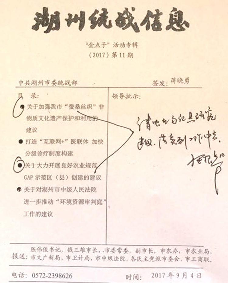 日前,中国民主促进会会员、艺术设计学院沈俊副教授撰写的资政成果《关于加强我市“蚕桑丝织”非物质文化遗产保护和利用的建议》得到了副市长施根宝的肯定性批示。批示指出:“请农业局汇总研究建议,落实到工作中去”。该资政成果发表于中共湖州市委统战部主办的《湖州统战信息》(“金点子”活动专辑)(2017)第11期。