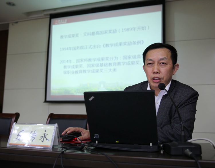 乐传永教授系全国教育科学规划领导小组成人教育学科组成员、教育部研究生学科评估专家、教育部人文社科项目评审专家;兼任中国成人教育协会学术委员会副主任、常务理事。主要从事成人教育理论、成人教育管理、终身教育和国际成人教育比较研究等。主持完成了20余项国家级、省部级重点课题,出版著作12部,在《教育研究》《教育发展研究》等核心期刊发表学术论文280余篇,其中70余篇论文分别被《新华文摘》《人大复印资料》全文转载。获国家教学成果一等奖1项、二等奖2项、省级教学成果一等奖3项、二等奖2项。讲座中,乐传永教授阐释了教学成果奖的选题内容、教学成果奖的实践过程、教学成果奖的申报撰写等内容,并以自己的获奖教学成果为案例介绍了教学成果的形成和材料撰写过程。整场报告内容丰富,通俗易懂,既有理论高度的思考,又有实践深度的探索,有很强的针对性和实用性,对全面了解教学成果的内涵、如何申报教学成果奖具有十分重要的指导意义。