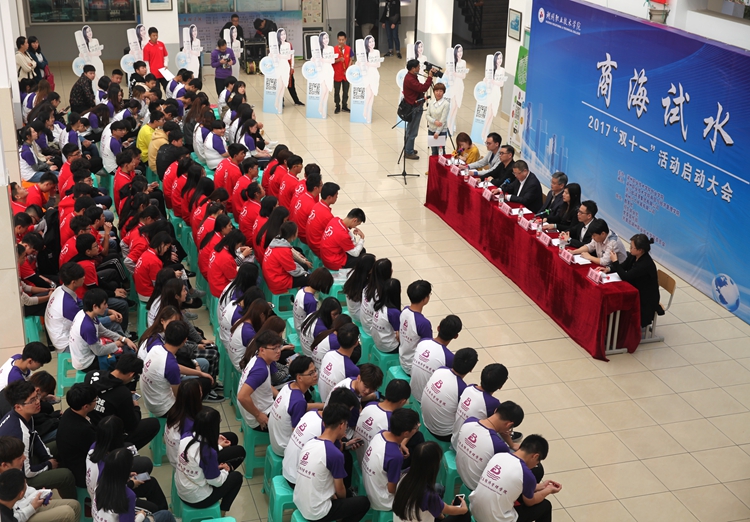 11月8日下午,由创业学院、商贸与经济管理学院、湖州市电子商务促进会、德清县电子商务协会等联合主办的“商海试水”2017“双十一”启动仪式在圆顶大厅举行。创业学院院长胡世明教授、湖州电子商务促进会会长陈忠、德清县商务局电子商务处处长朱峰、德清电子商务协会秘书长盛赐亮、浙江欧诗漫集团人力资源部主任赵雯、浙江欧诗漫信息技术有限公司副总方博云、湖州沙力电器有限人力资源部部长邓婷婷及商贸与经济管理学院党政负责人,电子商务专业2017级全体学生参加启动仪式。