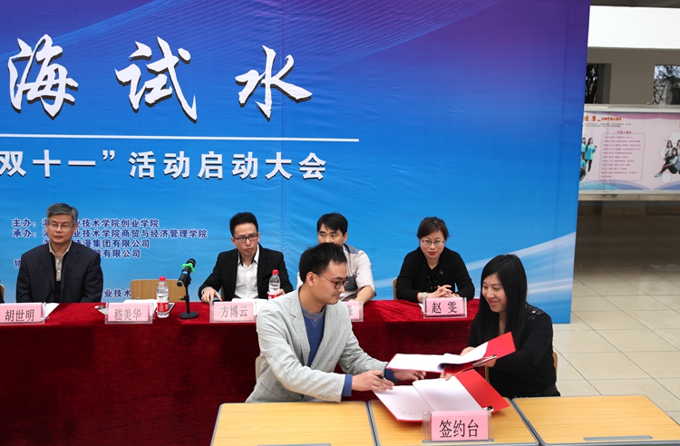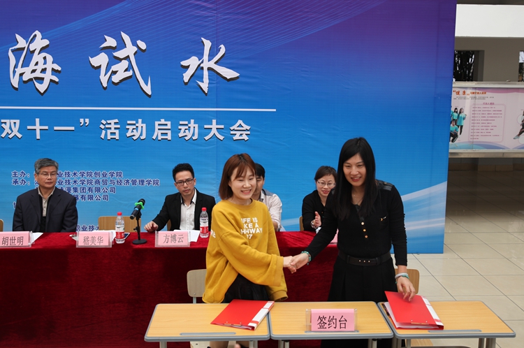 胡世明宣布“商海试水”2017“双十一”活动正式启动。启动仪式上,商贸与经济管理学院分别与德清县电子商务协会、湖州沙力电器有限公司签订了合作协议。根据协议,商贸与经济管理学院将发挥专业、师资优势,利用学院的软、硬件教学资源,推进与企业在订单班、现代学徒制、员工技能培训考证、电子商务研究院等在内的多渠道资源对接性合作;合作企业作为商贸与经济管理学院的校外实训基地,将尽可能满足学生在专业实训、毕业实习等方面的需求,为学生就业、创新创业提供更大空间。校地、校企联合举办“商海试水”2017“双十一”活动,一方面可以深入推进电子商务专业的“校企合作、产教融合”,另一方面,又可以为学生提供“实战”的项目和机会,让他们第一时间以企业员工的“身份”提前感受市场氛围、体验职业环境、培养职业精神。