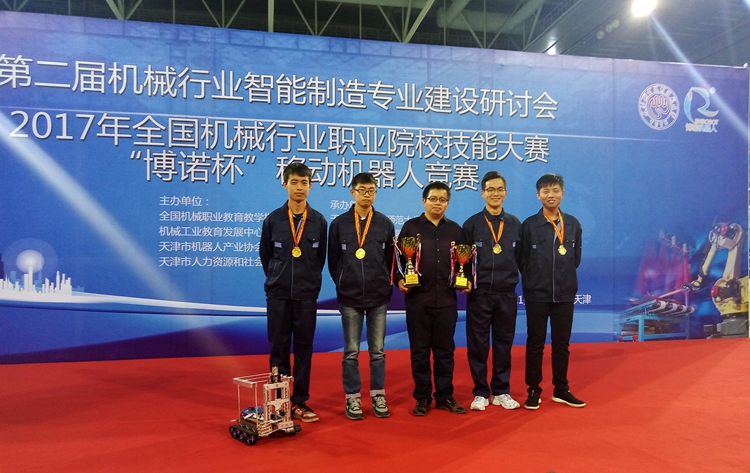 11月19日,2017年全国机械行业职业院校技能大赛——“博诺杯”移动机器人竞赛在天津职业技术师范大学落下帷幕。由机电与汽车工程学院机电1502舒�摇⒌缙�1603王云飞组成的参赛队荣获一等奖,机电1603徐钢、电气1601季祥焕组成的参赛队荣获二等奖。