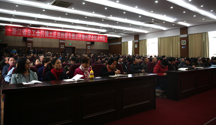 11月21日下午, 由浙江省总工会、湖州市总工会联合举办的“中国梦·劳动美——学习贯彻党的十九大精神”劳模工匠巡回报告会在1号报告厅举行。全市各界工会干部代表、职工代表,我校师生代表360余人聆听报告会。报告会由浙江省总工会宣教部部长李杭惠主持,校党委副书记、工会主席丁根林出席了报告会并致辞。