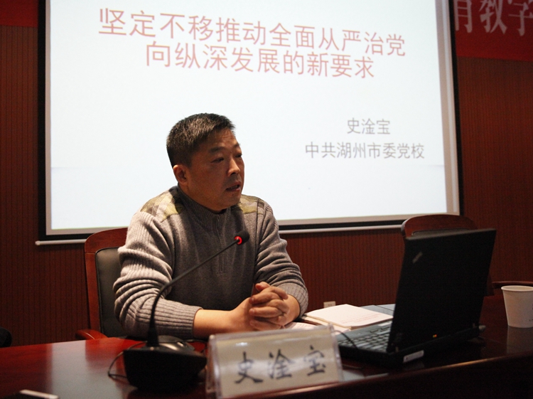 12月14日下午,学校思政辅导员学习贯彻十九大精神辅导报告会在教师发展中心举行。中共湖州市委党校副校长史淦宝副教授应邀作了题为《坚定不移推动全面从严治党向纵深发展的新要求》的专题辅导报告。校党委副书记丁根林主持报告会,学工部(学生处)负责人、团委负责人及管理干部、全日制二级学院全体专兼职辅导员参加报告会。