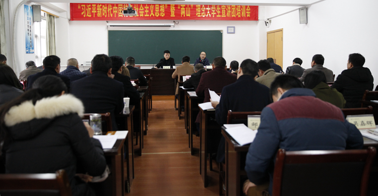 为深入学习宣传贯彻党的十九大精神,1月19日,学校举行全市电大系统“习近平新时代中国特色社会主义思想”暨“两山”理念大学生宣讲团培训会,校党委书记周家健出席并作十九大精神专题辅导报告,副校长叶主,党委宣传部、远程教育学院等部门负责人及教师代表,27位宣讲团成员参加了培训会。
