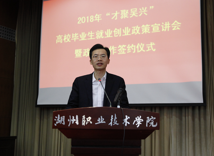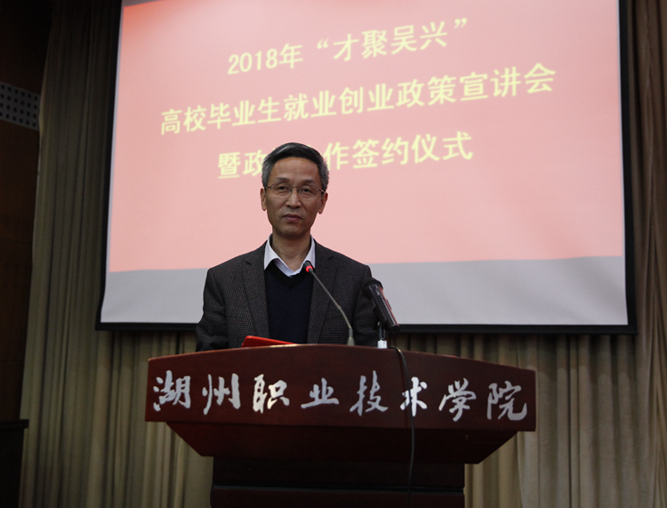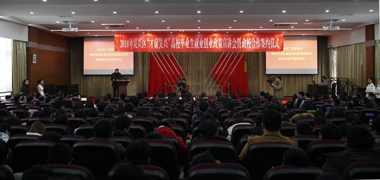 为全面贯彻湖州市政府关于“创十条”等文件精神,集聚更多大学生留湖就业创业,进一步促进学校与吴兴区企业无缝对接,1月19日下午,2018年“才聚吴兴”高校毕业生就业创业政策宣讲会暨政校合作签约仪式在学校1号报告厅隆重举行。校长沈建民、中共吴兴区委副书记、区长陈江、副校长丁继安、中共吴兴区委常委、常务副区长潘永锋等领导出席。