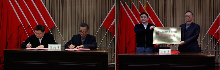 潘永锋、丁继安分别代表吴兴区政府与学校签订了政校人才智力全面战略合作协议,重点在人才对接、技术支持、产学研合作等方面开展多层次合作,并为学校“浙江省湖州市吴兴区人才工作站”授牌。大会同时授予久立集团、阿祥重工、东尼电子等41家企业为“湖州市吴兴区大学生就业创业实训基地”。