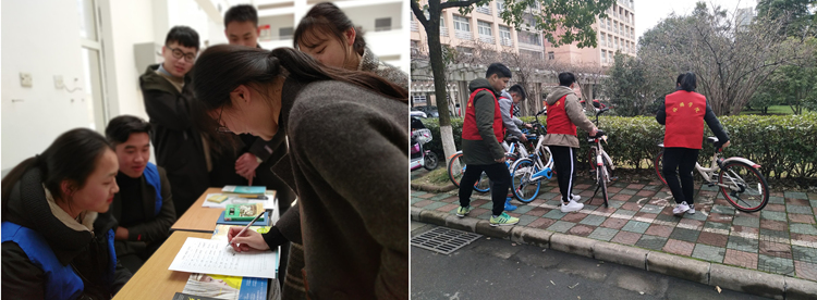 与往年一样,学校各级团学组织在3月伊始就提前策划起“学雷锋志愿服务月”活动;与往年不同的是,今年大家不约而同的将目光首先放在了“身边”。艺术设计学院团委发起“助您回校”公益接力活动,安排志愿者在学校主要出入口主动帮助返校学生,在校园内开展“以书换书,以心传心”活动;建筑工程学院团委组织志愿者在责任区域开展了卫生大扫除;旅游与公共管理学院团委开展了“扶起身边的每一辆共享单车”活动。