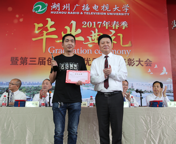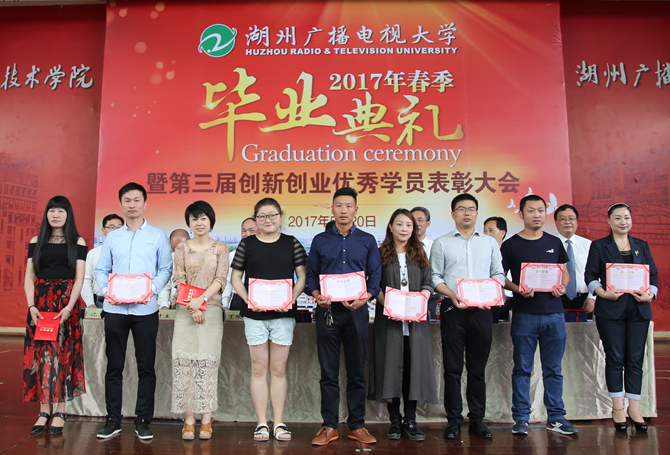 周家健为“创业之星”优秀学员一一颁发奖杯及荣誉证书,丁根林宣读湖州广播电视大学第三届“创业之星”优秀学员名单、2017年春季“湖州广播电视大学优秀毕业生”学员名单,在主席台就坐的学校党政领导为“优秀毕业生”颁奖,为毕业生代表颁发毕业证书。“创业之星”代表盛素红、优秀毕业生代表徐鹏分别作了主题发言,与全体毕业生分享了他们在创业和学习方面的心得、体会。