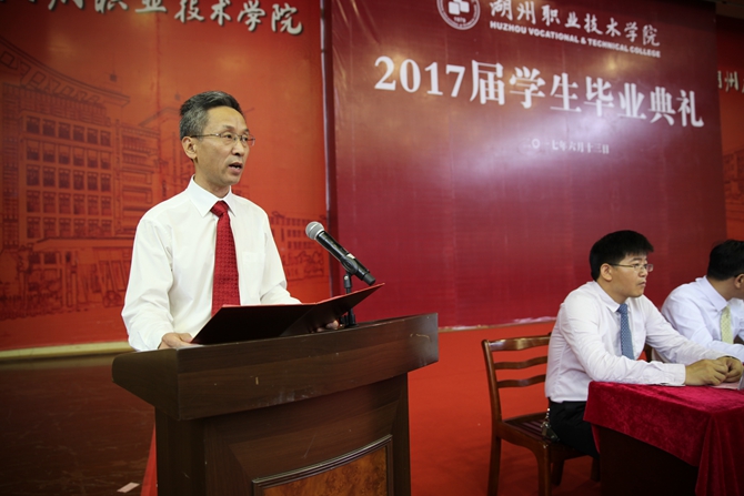 在庄严的国歌声中,毕业典礼正式拉开帷幕。沈建民代表学校向通过不懈努力顺利完成了学业,即将开启人生新的征程的2017届全体毕业生表示热烈的祝贺。“青春是用来奋斗的,奋斗才是青春最厚重的底色!人的一生只有一次青春,青年最富有朝气、最富有梦想,不应该只是无目标的碌碌无为和单纯的盼望等待。”作为校长和老师,沈建民以“奋斗的青青”为主题,与2017届毕业生分享了“青春”的三个关键词“梦想、干劲、担当”,表达了殷切希望和临行嘱托:一是奋斗要有梦想,让梦想照亮青春年华。希望2017届毕业生踏着实现中华民族伟大复兴的“中国梦”、《中国制造2025》、浙江省全力打造八大万亿产业等时代的节拍,把握机会,发挥专业优势,力争上游,用梦想开拓胸怀,用梦想放宽视野,执着追梦,努力圆梦。二是奋斗要有干劲,让干劲撑起一片天地。希望2017届毕业在做工作、干事业中锤炼“工匠精神”,投身“大众创业、万众创新”的浪潮,真正成为时代需要的充满干劲的弄潮儿和躬身力行的实干家。三是奋斗要有担当,让担当厚重生命底色。希望2017届毕业在未来的人生道路上始终保持积极进取的激情、乐观开朗的心态和昂扬向上的斗志,直面各种挑战,为自己担当,实现人生理想;为家庭担当,回报感恩之心;为民族担当,彰显公民责任;为国家担当,贡献聪明才智。