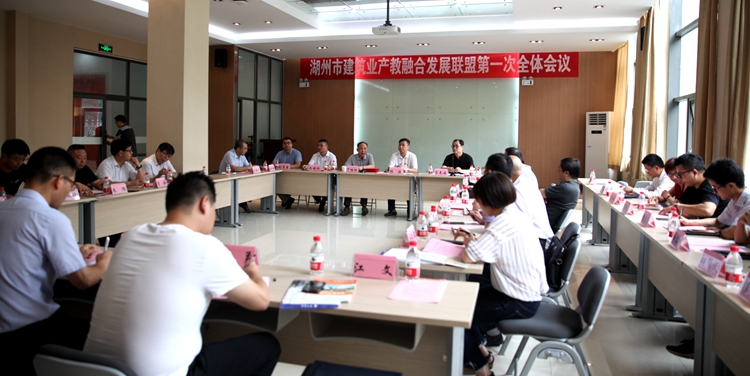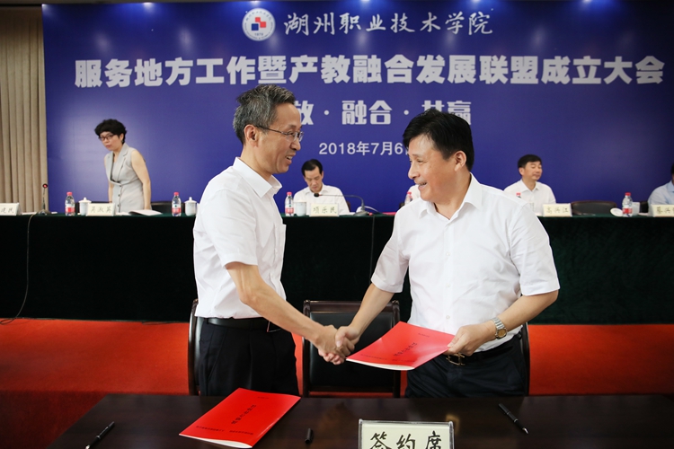 大会审议通过了《湖州职业技术学院产教融合发展联盟章程》和《湖州职业技术学院产教融合发展联盟成员单位》。学校为理事长单位, 80家本地龙头企业、合作企业、行业协会、中职学校担任副事理长和理事单位,产教融合发展联盟下设建筑业、新能源汽车、智能制造、智能电梯、物流与信息、商务贸易、旅游业、文化创意及农业农村等9个专业(群)产教融合联盟。