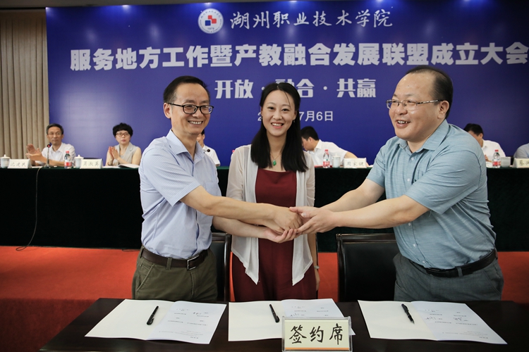 产教融合发展联盟是由学校发起,在市委市政府和行业企业的支持下,联合企业,协同行业(专业)协会共同组成的融汇“产学联动、人才培养、服务区域经济、促进社会建设、学校治理创新”等职能的联合体,是学校实现校企合作、产教融合的组织形式和合作平台,旨在发挥湖州市生态文明建设、“中国制造2025”示范城市、绿色金融改革创新试验区、创新型城市等优势,从人才、成果、项目、平台等各方面集聚资源,打造高等职业教育与产业协调发展的湖州模式。联盟成立以后,将密切与政府、行业、企业的联系,在产教融合共享校企合作资源、创新人才培养机制、共建技术研发中心、共建职业教育体系、共建信息服务平台、促进学校治理创新等方面推进各项工作。学校将借这次服务地方工作暨产教联盟成立大会的契机,进一步落实地校合作会议精神,推进产学研融通创新,深化与企业合作,优化高校服务供给,打造一批校企合作、产教融合的示范性基地、产业学院和协同创新平台,为湖州经济高质量发展提供强有力的智力支持和人才支撑。(文/杨朝峰 摄/杨朝峰 许少华)