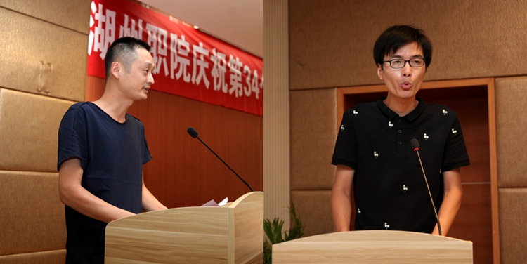 市级“三育人”先进个人代表、艺术设计学院教师方启元,学校2018年青年教师教学技能竞赛一等奖获得者、机电与汽车工程学院教师黄锋作大会交流发言。(文/杨朝峰 摄/杨勇平)