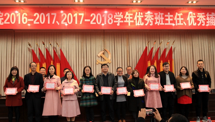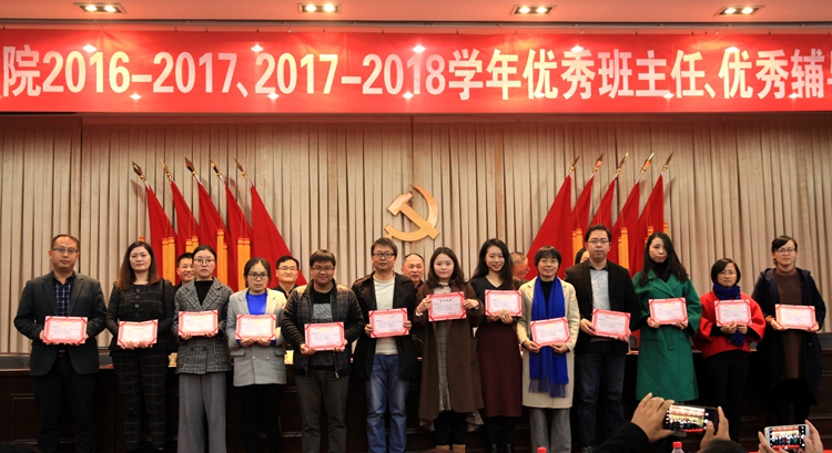 11月28日下午,学校2016-2017学年、2017-2018学年优秀班主任、优秀辅导员表彰大会在1号报告厅举行。党委副书记丁根林,副校长丁继安,党委宣传部、学生处、教务处、校团委等部门负责人,二级学院党总支负责人及全体班主任、专兼职辅导员、学生代表共300余人参加大会。会议由丁继安主持。