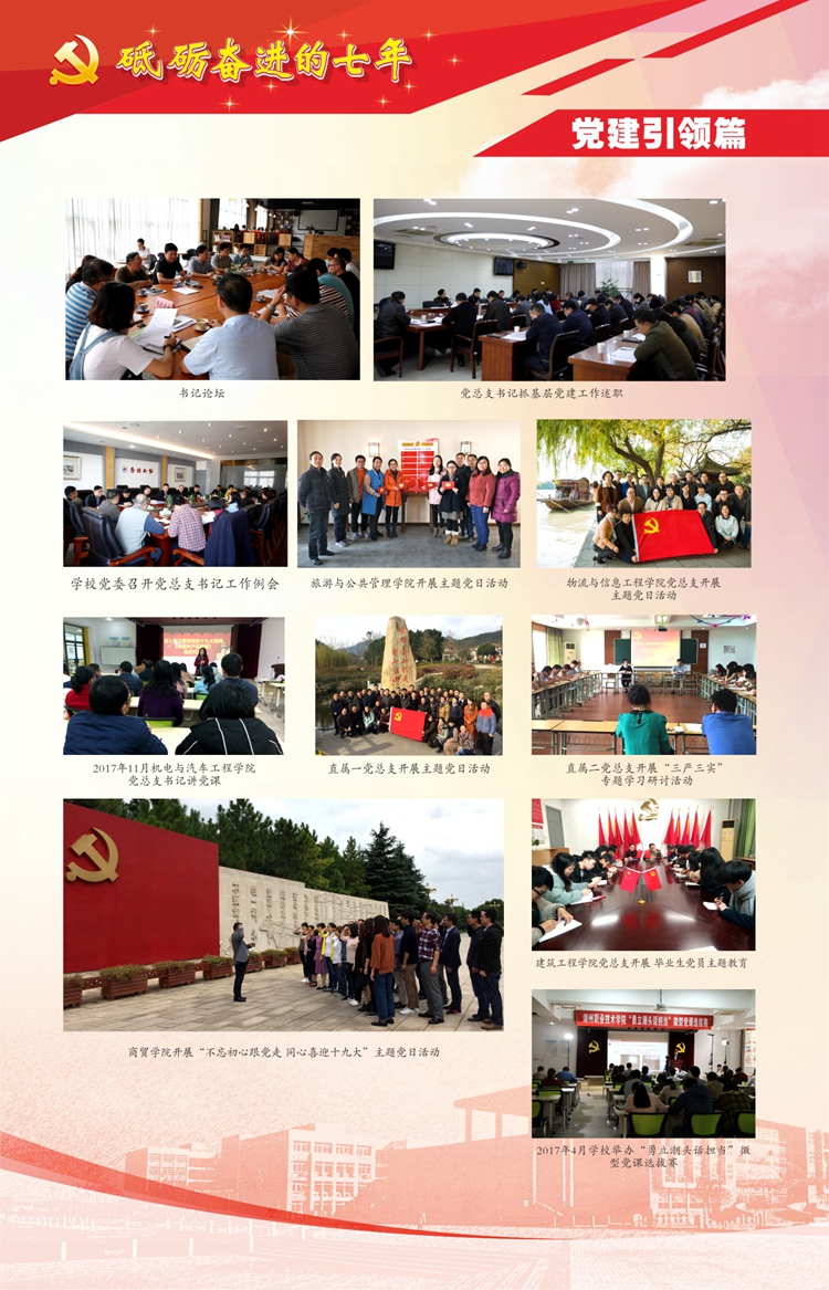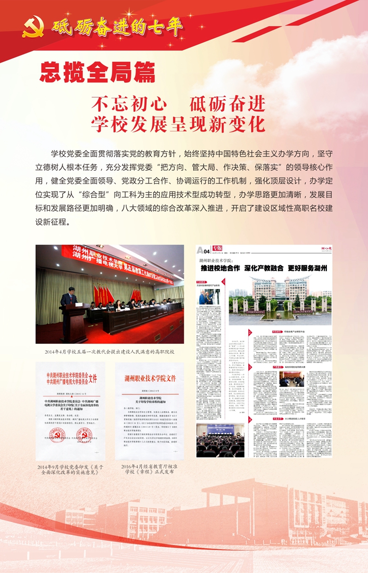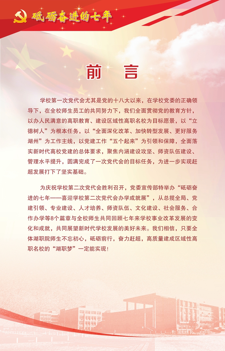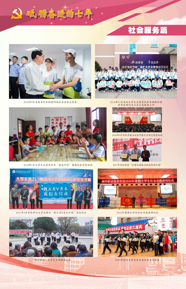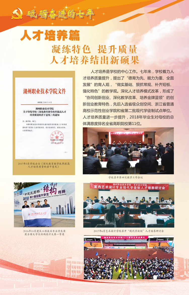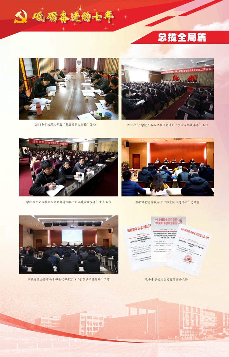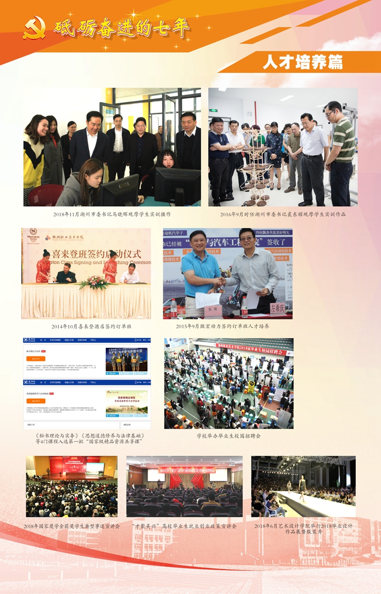 编者按:为庆祝学校第二次党代会胜利召开,党委宣传部特举办“砥砺奋进的七年——喜迎学校第二次党代会办学成就展”,从总览全局、党建引领、专业建设、人才培养、师资队伍、文化建设、社会服务、合作办学等8个篇章与全校师生共同回顾七年来学校事业改革发展的变化和成就,共同展望新时代学校发展的美好未来。我们相信,只要全体湖职院师生不忘初心,砥砺前行,奋力赶超,高质量建设区域性高职名校的“湖职梦”一定能实现!