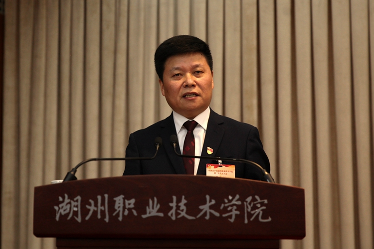 湖州市委常委、组织部长徐仲仪到会祝贺并讲话。周家健同志代表中国共产党湖州职业技术学院第一届委员会向大会作了题为《坚定改革前进 奋力担当作为 为高质量建成区域性高职名校而努力奋斗》的报告。