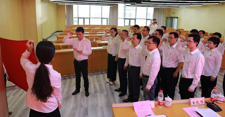 6月29日,学校党委召开新提任中层副职干部集体谈话会,校党委书记周家健作为领誓人,带领领导班子成员、新提拔中层副职干部重温入党誓词。