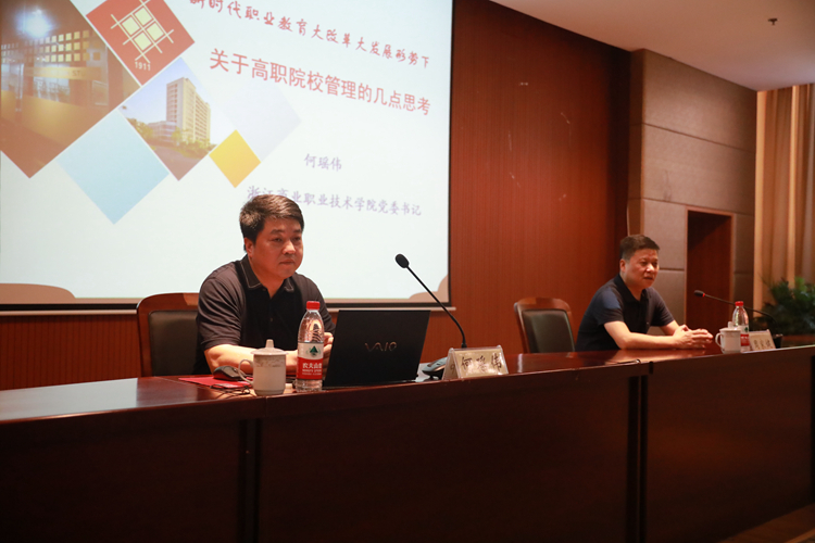 浙江商业职业技术学院党委书记何瑶伟作《新时代职业教育大改革大发展形势下关于高职院校管理的几点思考》的专题报告。何瑶伟结合自身丰富的高职院校管理经验,指出随着新经济、新技术、新业态的蓬勃兴起,面对新形势下党和国家赋予职业教育的高要求、新使命,新时代职业教育迎来前所未有的改革发展新机遇,在这一背景下,高职院校应当重视战略管理、绩效管理、基础管理、文化管理、党建管理,要将资源、政策投入到自身内涵建设上,以改革的思路和办法破解难题。他还特别强调党建管理层面要切实发挥学校党委的核心领导作用,加强思想建设和意识形态建设,加强基层党组织建设,落实全面从严治党,把“培养什么人”作为高职教育的首要问题,把立德树人的成效作为检验一切工作的根本标准。 (文/亓嘉 摄/郑强)