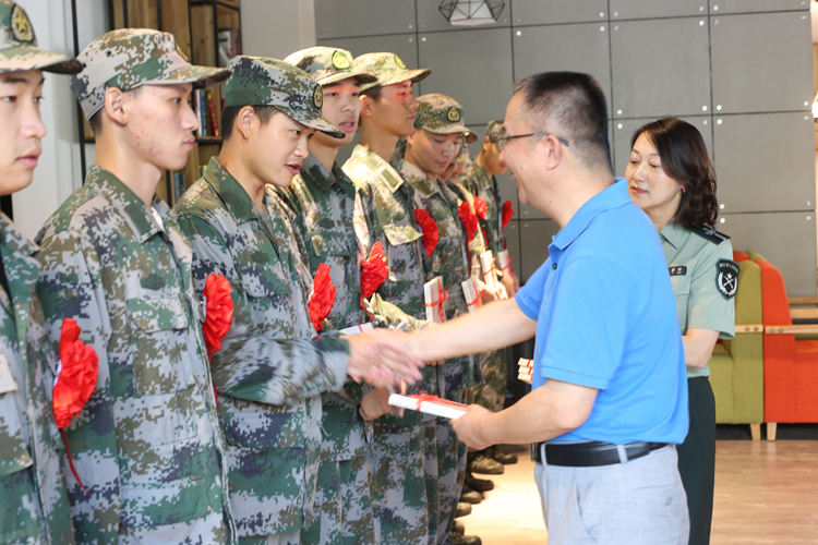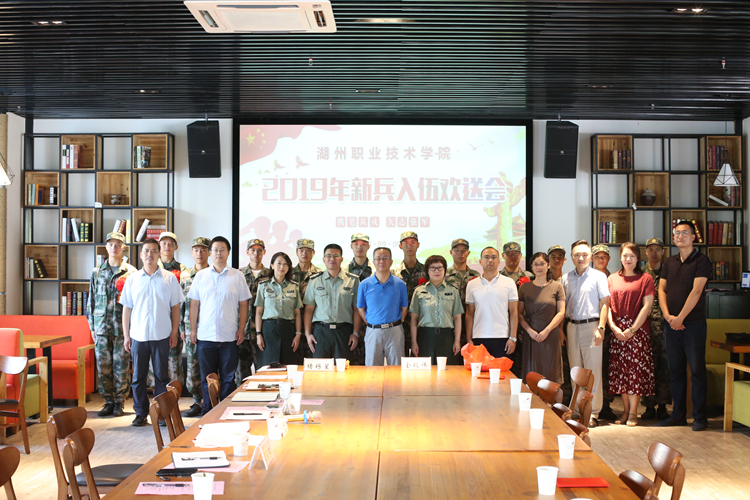 会上介绍了2019年学校征兵工作的相关情况,湖州市优秀退役军人”市营1801班陈潇阳向全体新兵分享了两年的部队生活和经验退役复学军人代表分享了部队生活体验,新兵代表进行了表态发言,各学院辅导员和班主任也送上了祝福和嘱托。会后,参会领导、老师向全体入伍新兵佩戴光荣花和赠送纪念品并合影留念。