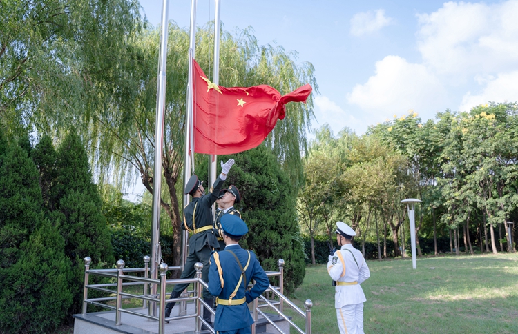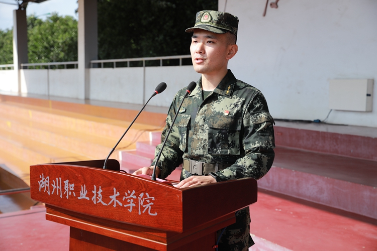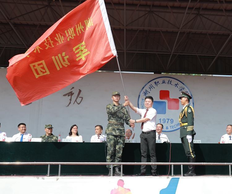 武警某部中尉胡昊作军训动员,校党委书记周家健为新生军训团授旗。