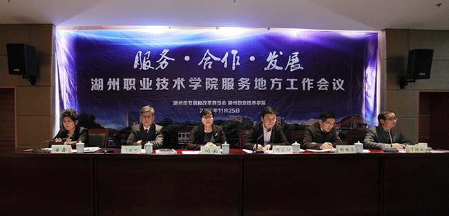 2015年,学校与市发改委联合召开首届学校服务地方工作会议,制定出台了《湖州职业技术学院服务湖州行动计划(2016—2020年)》,在高素质人才培养、高水平成果研发转化、决策信息咨询、先进文化传播等领域,全面支撑湖州“4+3+N”产业发展,为学校未来5年多领域、深层次、全方位参与服务地方经济社会发展工作明确了指导思想、工作目标和重点任务,也是学校更深融入地方、服务湖州的宣言书和行动纲领。2016年,学校成立了服务湖州行动计划领导小组,进一步完善顶层设计,同年10月,湖州市电梯培训基地和湖州国际旅游学院正式挂牌。