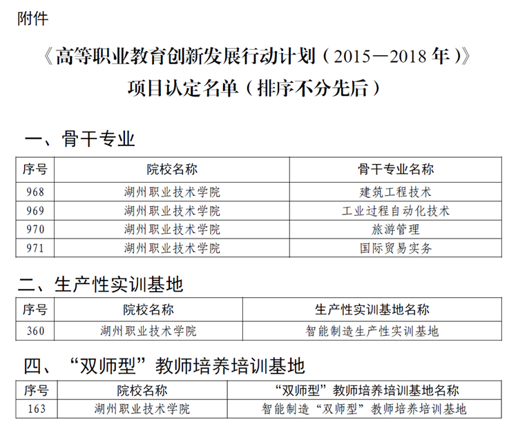 视点:7月1日,教育部公布了《高等职业教育创新发展行动计划(2015—2018年)》项目认定结果。我校骨干专业、生产性实训基地和“双师型”教师培养培训基地等三个项目通过认定。其中,建筑工程技术、工业过程自动化技术、旅游管理和国际贸易实务等4个专业被认定为骨干专业,智能制造生产性实训基地被认定为生产性实训基地,智能制造“双师型”教师培养培训基地被认定为“双师型”教师培养培训基地。