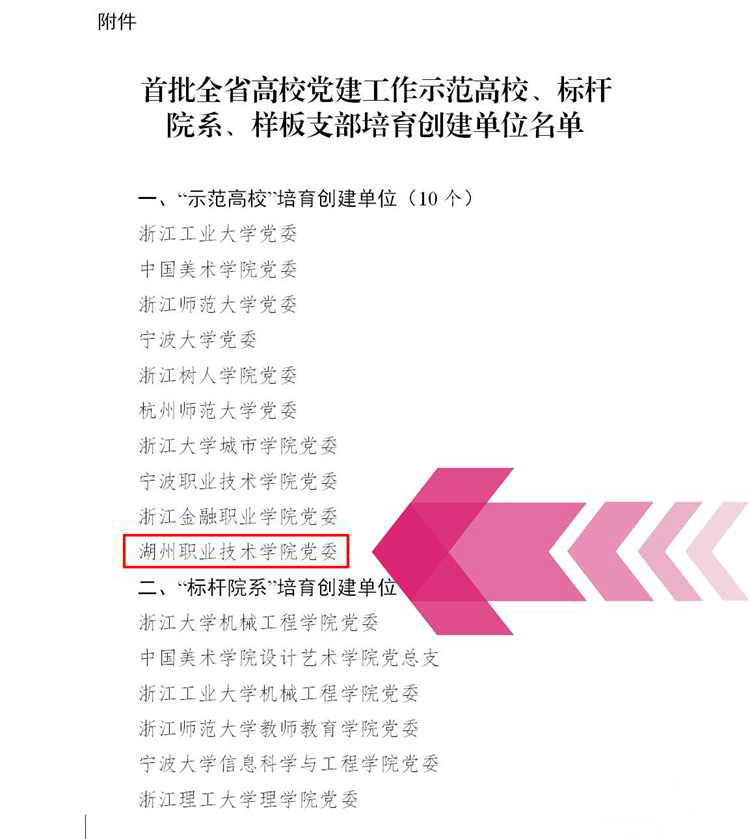 视点:10月25日,我校党委入选首批全省高校党建工作“示范高校”培育创建单位。近年来,学校党委以“基层组织强起来、党务干部硬起来、党风廉政严起来、党建研究热起来、党建工作实起来”的“五个起来”党建工作思路目标,扎实推进全面从严治党向纵深发展,有力提升学校管党治党、办学治校能力和水平,努力开创党建与中心工作融合发展的新局面。学校党委“五个起来”入选首批全省高校党建特色品牌,“创客家园”党建示范群入选首批全省高校党建示范群。入选首批全省高校党建工作“示范高校”培育创建单位,标志着我校在推进新时代学校党建工作“五个起来”取得阶段性成果。学校将以此为契机,在加强组织领导、形成工作合力、强化目标考核等方面持续深入推进“五个起来”,为学校“全面深化改革、加快转型发展、更好服务湖州”和建设区域性高职名校提供坚强的政治保证、思想保证、组织保证。