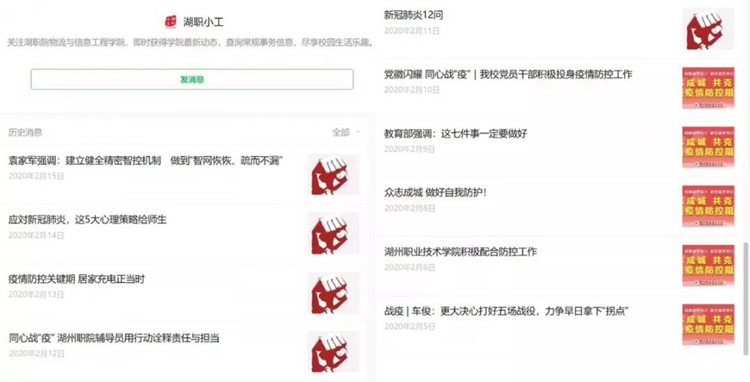 学院通过学院微信公众号“湖职小工”、教师微信群、辅导员微信群、班主任QQ群、主要学生干部QQ群等网络平台第一时间转发浙江发布、湖州发布、学校官微的官方信息,加强师生思想引领,宣传疫情信息,传播科学防控知识。
