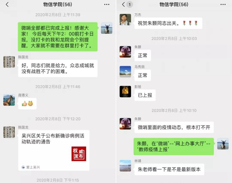 农历正月初二开始至今,在学院党员干部的带动督促下,学院教师每天都会按时在微信群、微哨等平台上完成疫情期间的“健康打卡”。个人动向第一时间向学院报告已经成为了物信学院教师的“条件反射”。
