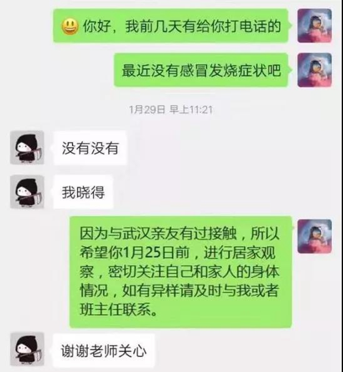 加强排查,关注重点。在做好疫情期间师生健康和动向的排摸工作的基础上,学院安排了党员教师对于重点疫区的师生进行“点对点”联系。对于前往过湖北或武汉地区以及与武汉亲友有过接触的同学,学院的党员教师每天都会通过微信、QQ和电话与他们联系,了解他们和家人的健康状况,安抚他们的情绪,叮嘱他们要配合当地社(村)安心居家隔离,定时测量体温。