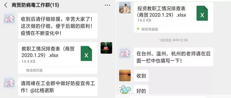 在前期全面摸排的基础上,1月29日学院通过微信、电话、QQ等工具提前对学院全体教师寒假去向和身体情况做了一个全面排查、确定了重点关心对象,并进一步对全体72名教职工及其居家亲属的人数和身体情况以及省内疫情况较严重地区的旅游史、接触史等情况进行了精准排查。对重点关注的教师实施学院领导一对一联系制度,关注他们的身体健康、生活困难情况。截止2月14日,学院72名教职工中在湖州53人(其中居家医学观察2人);在外地19人(其中湖北省2人,台州温岭1人),均身体健康。
