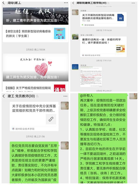 学院的线上学生管理取得了显著成效,尤其在疫病传播初期,确保了学生掌握科学、有效的防疫知识,及时掌握了学生的健康动态。市政专业小李同学自述1月20日接触武汉返乡同学,但所在社区并未及时排查发现。学院获知后随即将其确定为重点关注对象,学工办主任杨志帆了解了该生及其家庭成员健康状况,反复教育劝说其及时向社区主动汇报、自觉隔离,最终得到该生及家长的理解和积极配合。同时,学院还积极开展在线教学的准备工作。各教研室认真备课,班主任做好提醒、通知工作,确保线上课堂有序开展。