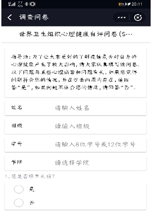 疫情形势下的心理援助更其特殊的地方,为了保证工作的严谨,2月17日,校心理健康教育咨询中心的陈功老师根据中国心理学会注册系统公布的《情特殊事情网络心理咨询工作指南》制作了《疫情期间心理危机干预筛查表》,发放到学院。