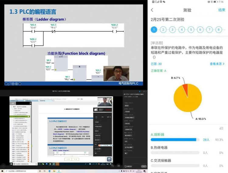 为了使教师熟练操作线上教学平台,掌握线上教学的基本技能,2月20日,工业过程自动化技术专业教学团队借助网络直播结合操作教学视频的方式,在网上开展了平台使用的集中培训。王荣扬等熟悉线上教学的教师作为培训教师,通过一次次的师生角色互演让团队教师们了解了线上课堂的教学要点,一次次的音效调试、资源分享测试让团队教师们逐步掌握了平台操作的技巧。针对在2月22日预授课中发现的平台卡顿、学生进不了课程界面等问题,教学团队连夜召开教学研讨会,制定了应急预案。每位教师在主平台以外都准备了线上教学的第二套方案。