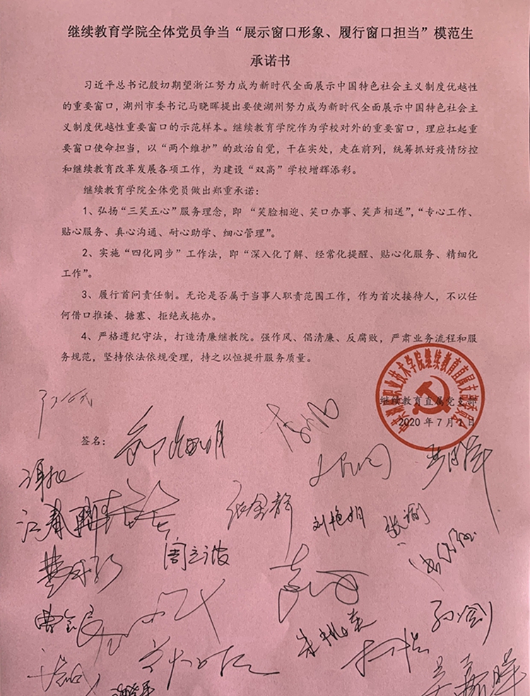 继续教育直属党支部组织党员在《继续教育学院全体党员争当“展示窗口形象、履行窗口担当”模范生承诺书》上进行签名,号召全体党员进一步提高政治站位,强化继续教育“重要窗口”的政治担当和使命责任,切实把思想和行动统一到“双高”担当作为上来。