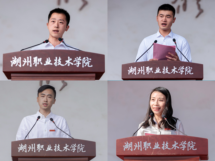 教师代表物流与信息工程学院卢��老师,校友代表中智游集团常务副总裁郑志鹏,老生代表建筑工程学院汪磊同学,新生代表商贸与经济管理学院程志同学在典礼上发言。