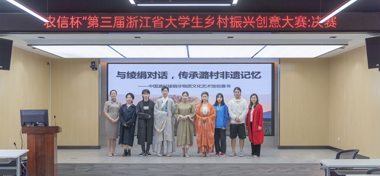 该竞赛是浙江省乡村振兴类的最高级别的大学生科技竞赛,相关学院高度重视,精心准备比赛。参赛师生通过深入潞村实地调研、前往绫绢研究所进行学习和探讨,撰写出《与绫绢对话,传承潞村非遗记忆,中国潞村绫绢非物质文化艺术馆创意书》,并通过网上汇报答辩的方式来展示自己的项目,经过激烈的角逐,获得了“农信杯”第三届浙江省大学生乡村振兴创意大赛银奖。
