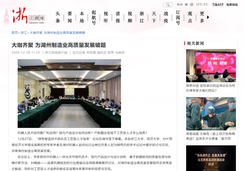 2020年12月28日《浙江新闻》刊发了题为《大咖齐聚 为湖州制造业高质量发展破题》的报道