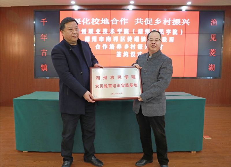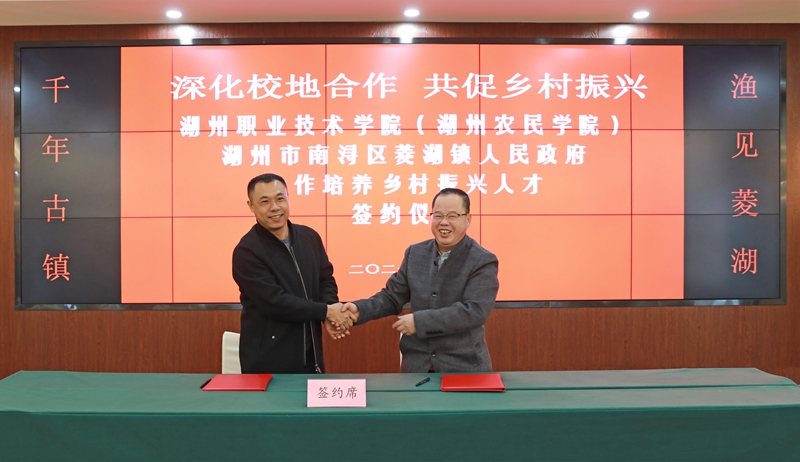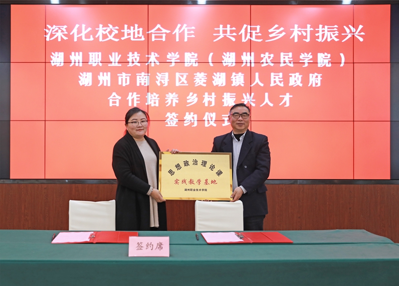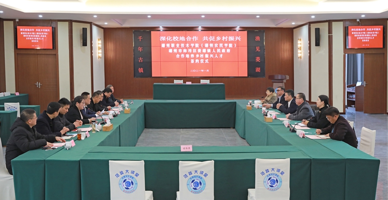 1月28日上午,我校与湖州市南浔区菱湖镇人民政府合作培养乡村振兴人才签约仪式在南浔区菱湖镇范蠡大讲堂举行。校党委书记周家健、菱湖镇党委书记沈其民、菱湖镇党委副书记、镇长李建平、菱湖镇党委副书记陈莉、校继续教育学院院长钱伟茂、校思政理论教研部主任张合营等相关领导和同志出席签约仪式并见证签约。