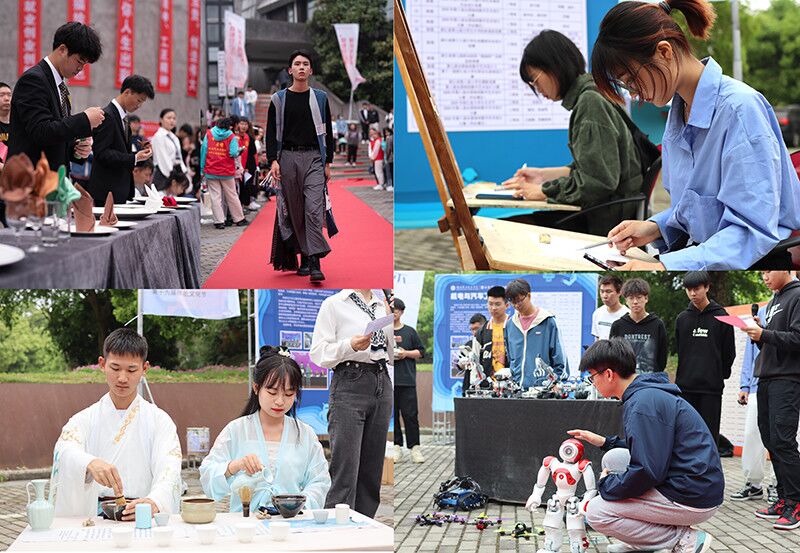 开幕式后,6个二级学院展示了精心准备的11项专业技能展演。无人机喷雾飞行表演拉开了展演序幕,Nao与乐高、宋代点茶茶艺展演、酒店服务礼仪、观光塔结构模型模拟地震振动、工程测量、服装设计走秀、现场速写、点钞技法、礼仪操、四旋翼无人机飞行器等技能展示节目轮番登场,展演活动充分彰显了技能文化节“迎建党百年 展技能风采”的主题,异彩纷呈,魅力四射。