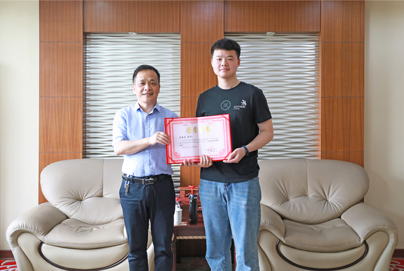 座谈中,沈建民代表学校对安吉职业教育中心学校一行的到来表示欢迎,并对安吉职业教育中心一直以来为我校人才培养工作所做的贡献表示感谢。同时,沈建民与全国技能大赛银奖获得者马澳龙亲切交谈,对他在首届全国职业技能大赛所取得的成绩表示祝贺,希望他能够再接再厉、取得更大的成绩,展现湖职学子的风采、责任和担当,同时希望他能发挥头雁作用,把备赛、参赛的宝贵经验分享给同学们。马澳龙向沈建民汇报了参加全国职业技能大赛有关情况,他非常感恩学校一直以来给予的关心支持和鼓励帮助,并会始终牢记和弘扬“崇德尚能”的校训,积极担当作为,争取更好成绩。副校长陆勤丰向马澳龙颁发了湖州职业技术学院“专业技能竞赛特等奖”荣誉证书及奖金。