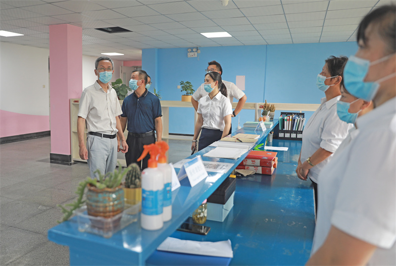 沈建民一行首先实地观摩了开学疫情防控演练及公寓内出现密接人员处置演练。负责老师及同学们实地模拟了校门口学生进校、发现行程卡异常者的处置,以及校内出现次密接人员的特殊情况处理。整个演练流程安排紧凑、处理流畅。接着,沈建民一行实地检查了出租店面的疫情防控人员管理及消防安全、卫生管理;检查了隔离点的环境卫生及消毒演示、设施设备情况。检查组一行又前往7号专家楼、恬园餐厅、学校操场及10号教学楼等地检查开学基建及实训工地情况,排查在建施工场地安全隐患,掌握各项开学准备进展情况。